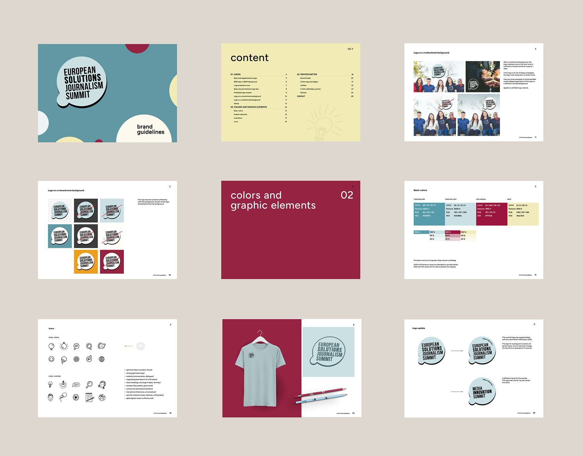 Nejprve vznikla vizuální identita pro European Solutions Journalism Summit, včetně vlastních ikon, brand guidelines a vybraných tiskovin. Na úspěch prvního ročníku navázal rok později Media Innovation Summit, pro který jsme vytvořili nejen aktuální podobu značky, ale i princip rozšiřitelný pro další summity a novou sadu ilustrací.